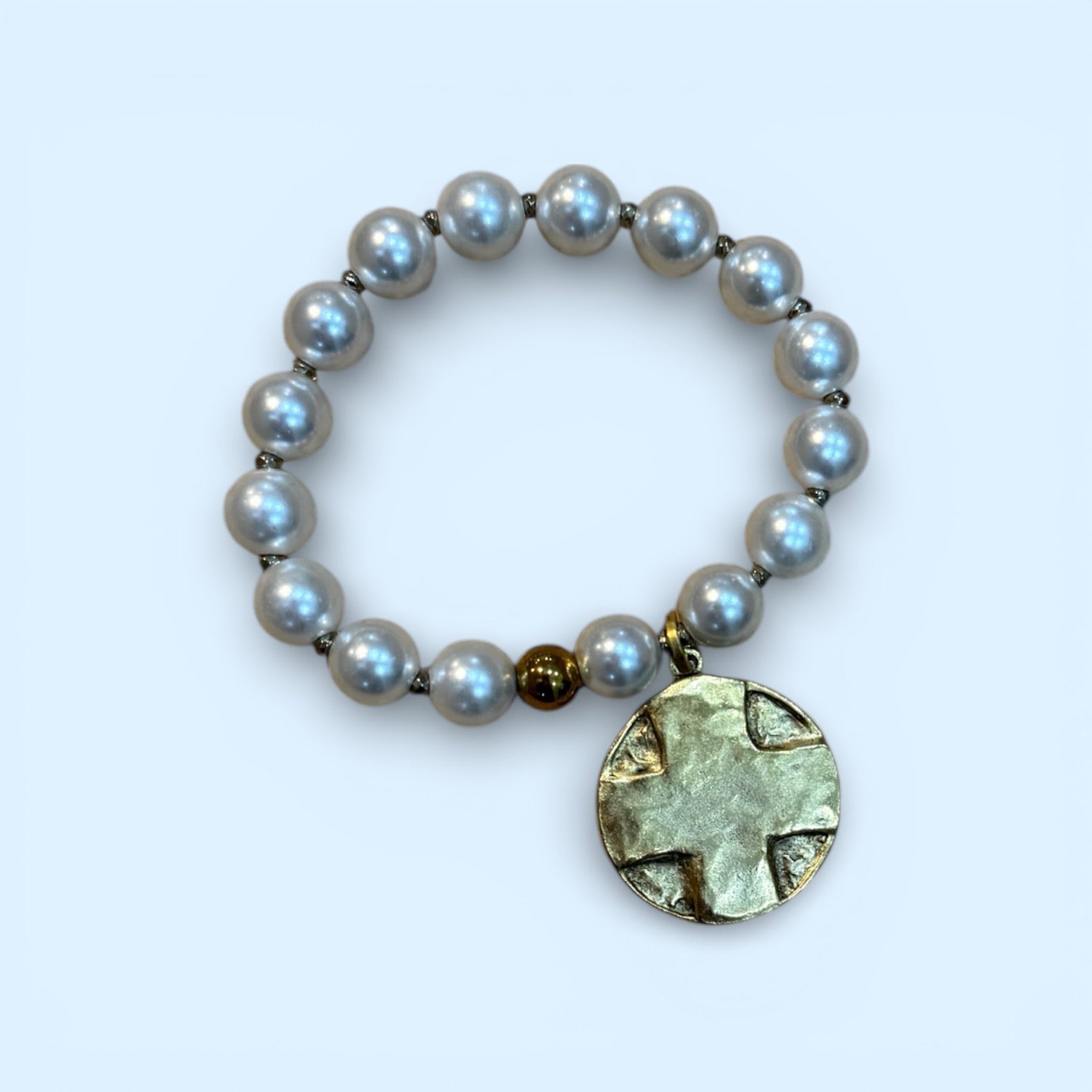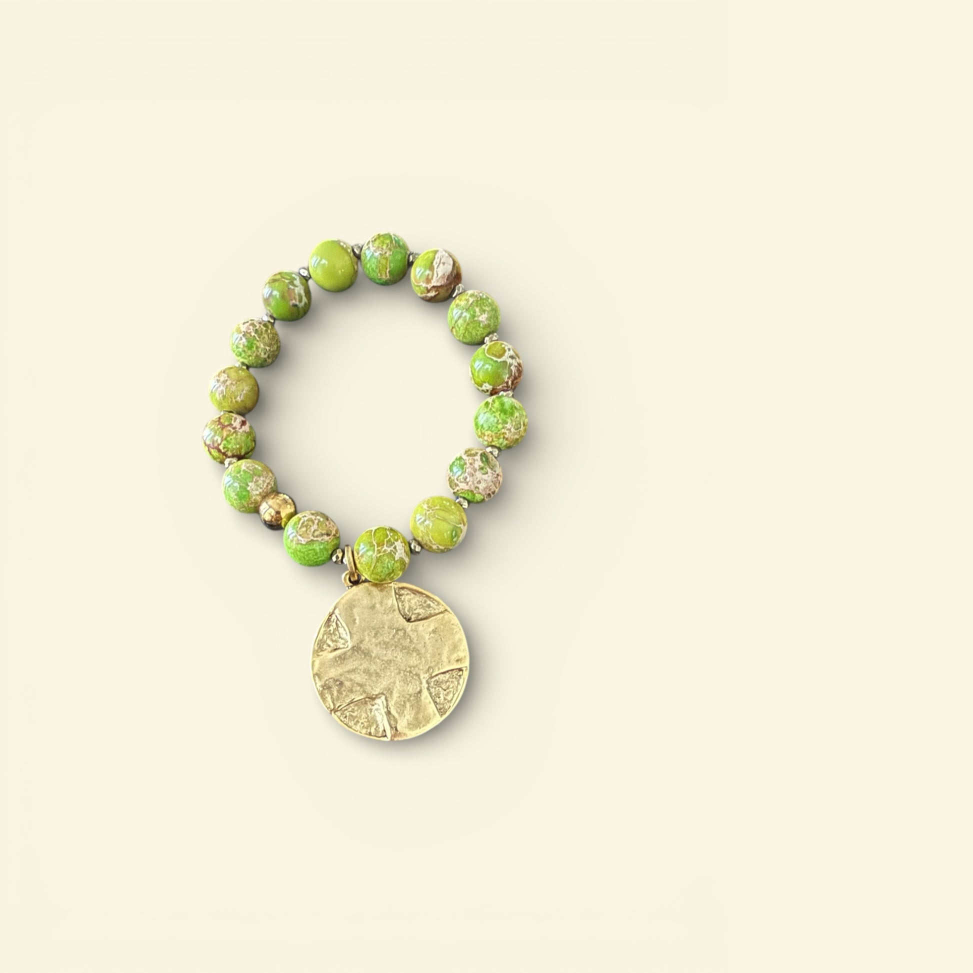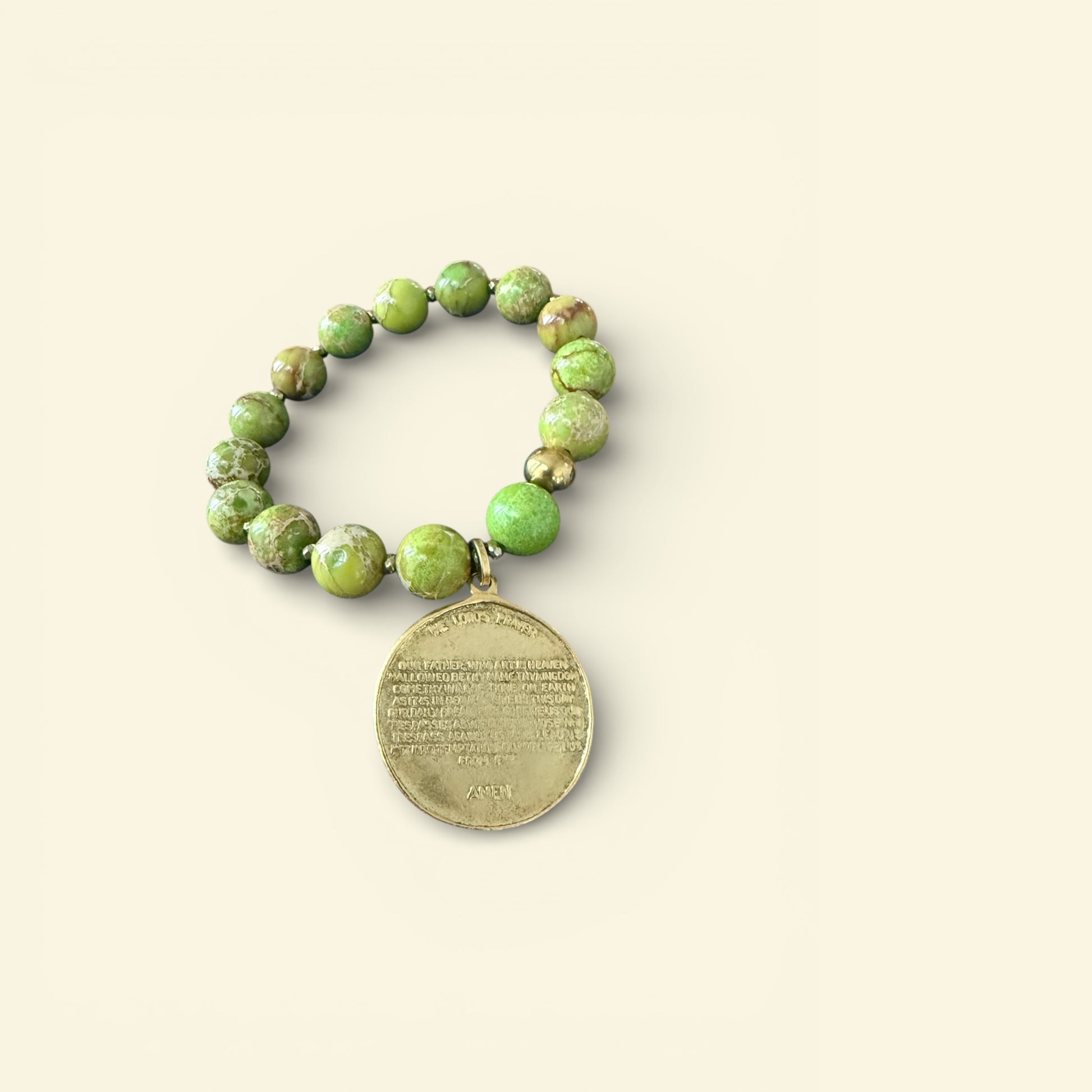 Enhance your spiritual journey with The Lord’s Prayer Bracelets. The stretchy beaded band features a matte gold finish round etched cross with the powerful Lord’s Prayer verse inscribed on the back. The green marbled beads and gold charm add a touch of elegance to this top-quality, non-tarnishing bracelet.
